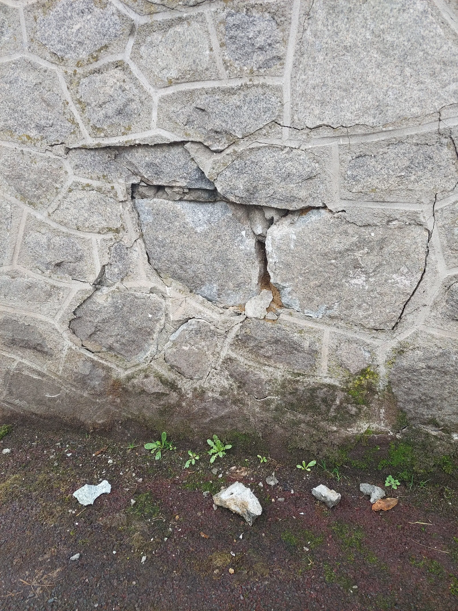 Suite à un accident de la circulation, il a fallu reprendre le bas d'un mur en pierre de granit et refaire les joints à l'identique .