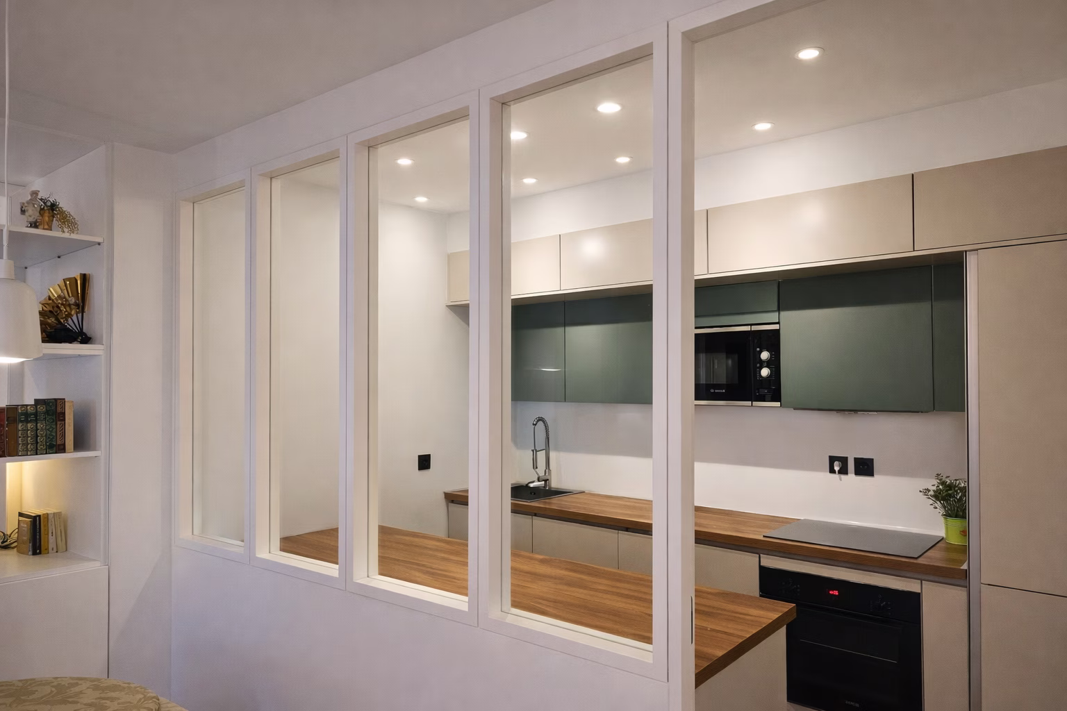 L'objectif premier était de remplacer la cuisine triste qui avait été livrée avec l'appartement et délimiter les espaces cuisine et séjour. Pour répondre à cette problématique, la phase de conception menée par un architecte d'inltérieur a permis de valider une conception moderne à double plans de travail avec de l'electroménager 100% encastré. La cuisine est desormais fermée par une verrière pour séparer les espaces.