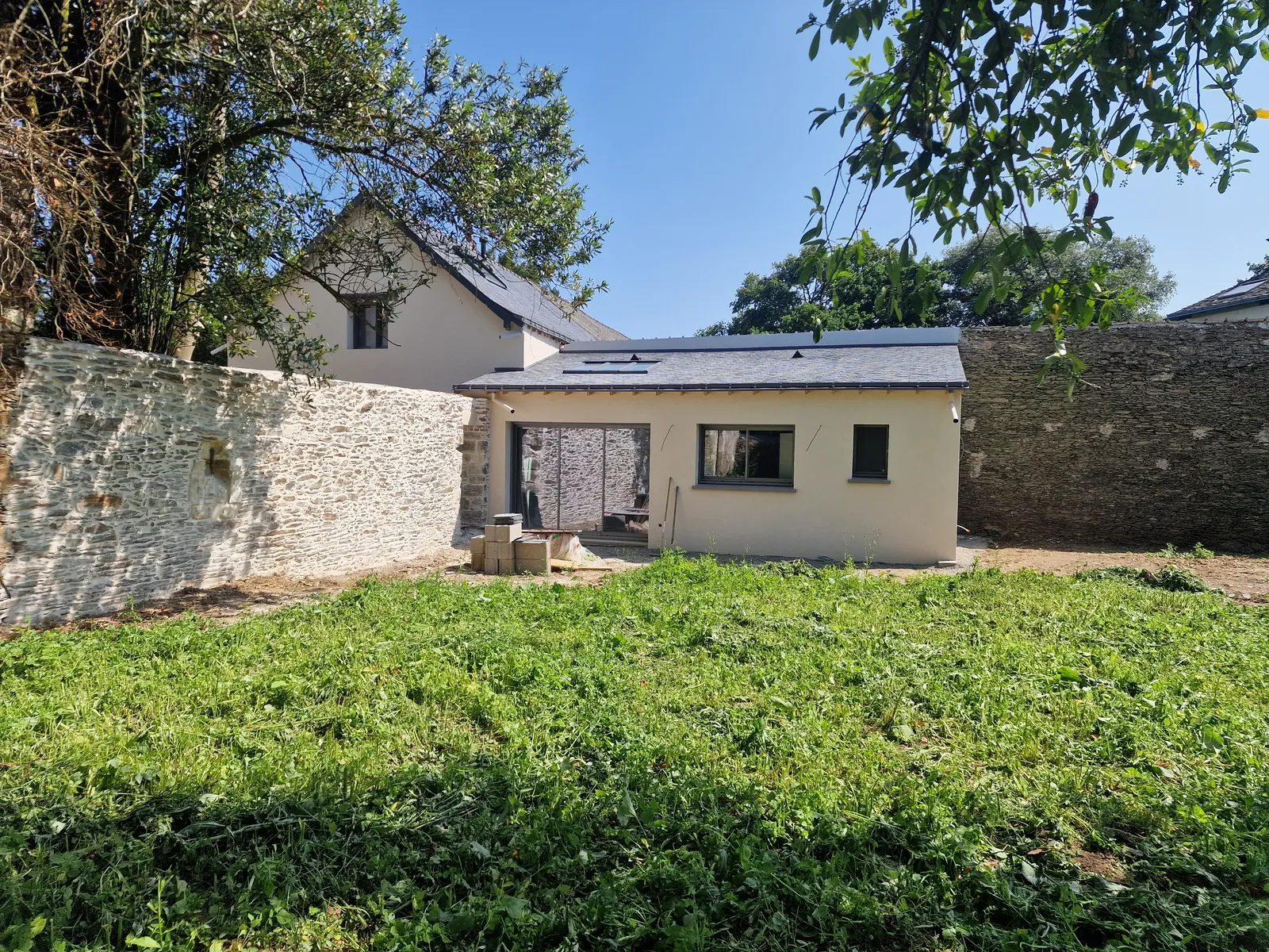 Réalisation d’une extension de 38 m² en parpaing, avec une couverture en ardoise, parfaitement intégrée à l’existant.