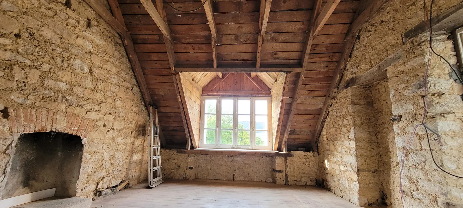 La charpente a été renforcée selon les règles de l’art, avec remplacement des bois dégradés et consolidation des assemblages. En parallèle, les menuiseries extérieures ont été remplacées, leur étanchéité étant défaillante et à l’origine des désordres. Cette opération a permis de restaurer la protection hygrométrique du bâti.