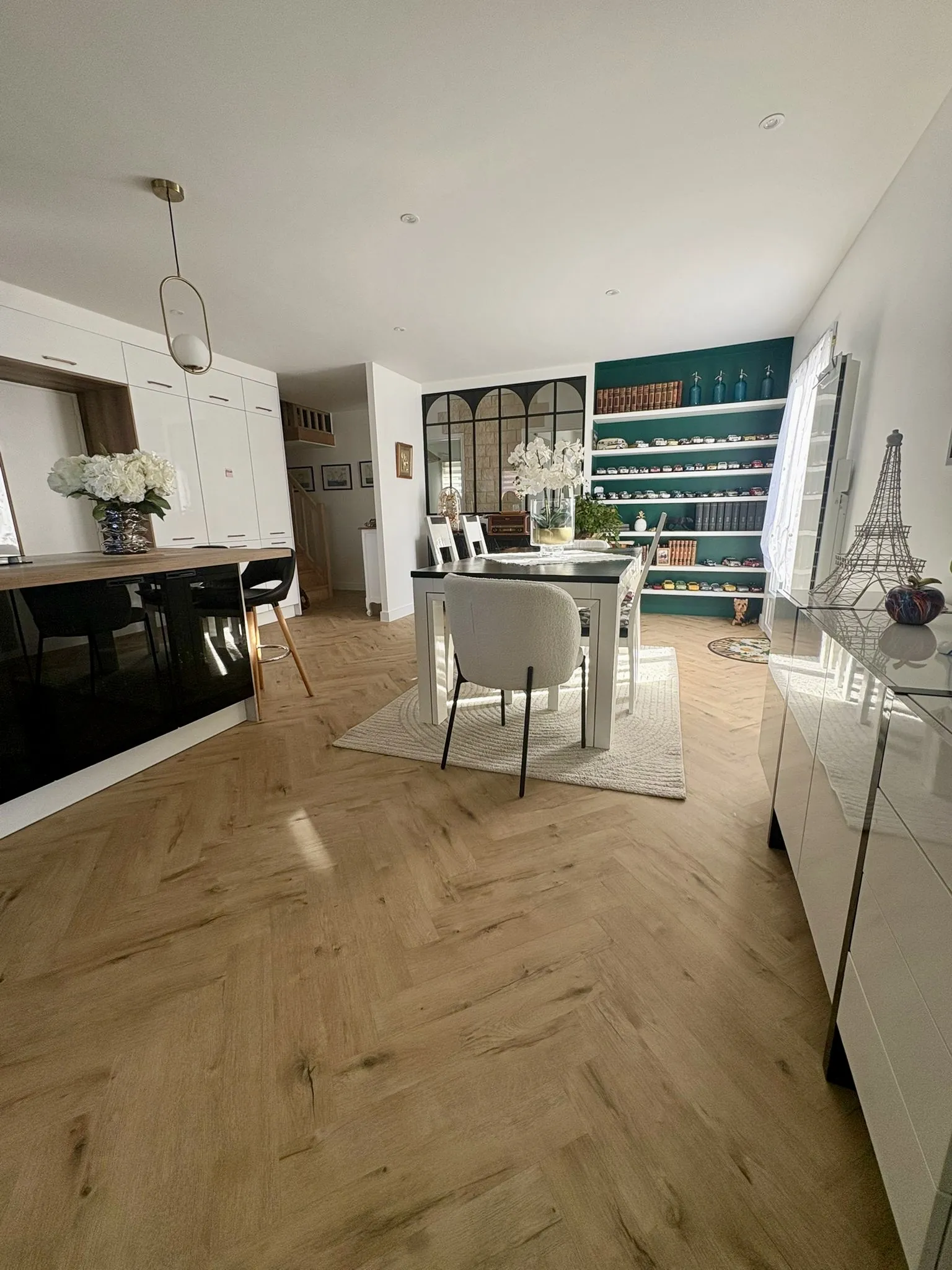 L’un des enjeux majeurs de cette rénovation a été le réaménagement intérieur. La suppression d’une chambre a permis d’agrandir significativement la pièce de vie, offrant désormais un espace plus fluide, plus lumineux et mieux adapté aux usages du quotidien.