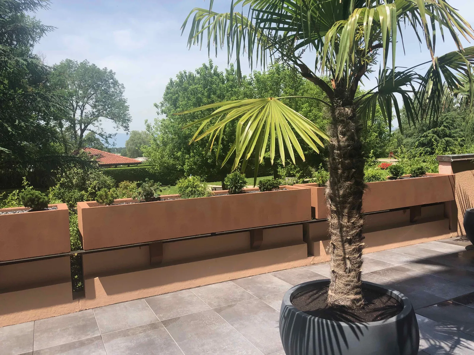 Le sol de la terrasse a été recouvert de dalle de grande taille, effet ardoise, posées sur plots. Un paysagiste s'est chargé de trouver et d'installer les plantations adaptées.