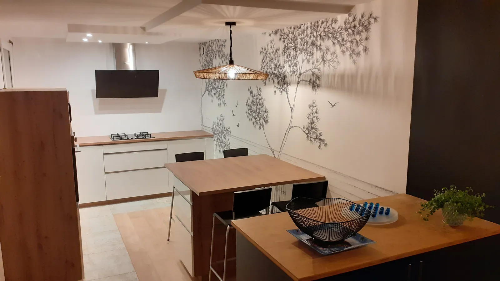 parquet semi-massif huilé, bande de propreté carrelée sous le linéaire, panoramique mural XXL, peinture murs & plafonds, habillages soignés.