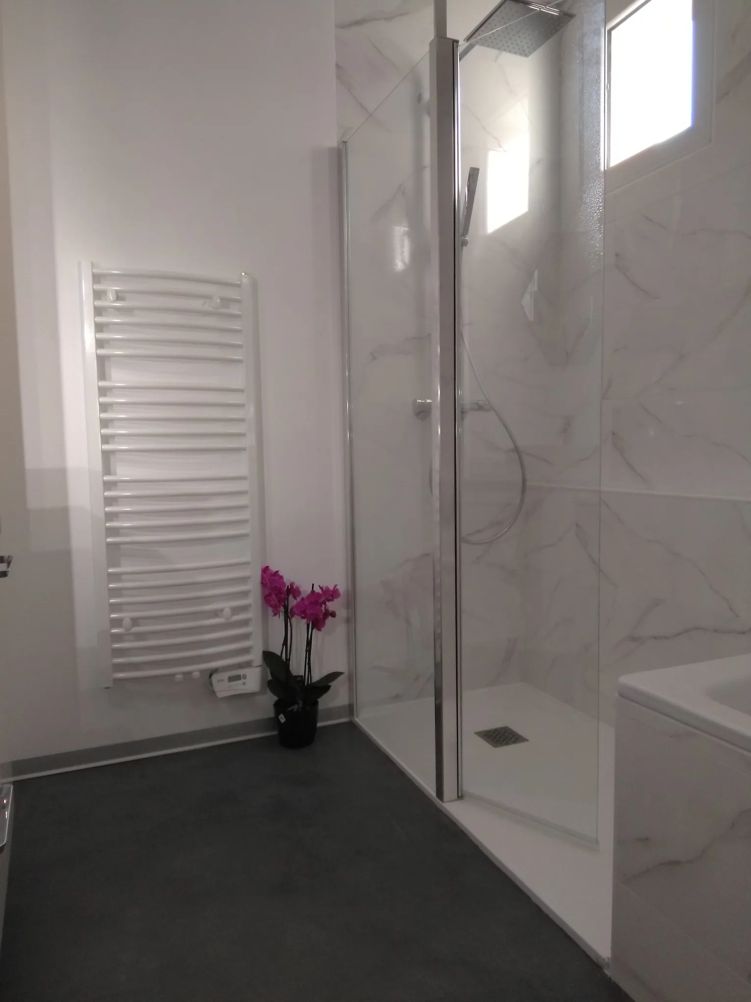 Les finitions sobres et durables (carrelage calacatta, menuiseries blanches, robinetterie chromée) offrent une harmonie élégante et intemporelle.